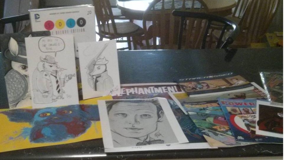 I feel a little bad about this now in retrospect, but I discussed and displayed a copy of The City of Smoke & Mirrors to a number of artists. As I’ll post in a moment, I got sketches from some artists. But yeah, while I did talk to many artists and ask about themselves, I also took a small bit of time to mention or show my book. Most were very interested, or at least appeared to be. While discussing it with one artist, someone overheard me and asked if I had a card. I didn’t, but I took theirs. They were an another artist. SO MANY ARTISTS. Even ones without tables!